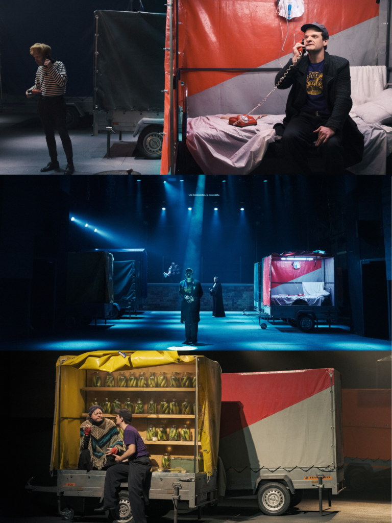 “The Return” (Lith. “Sugrįžimas”) is a modern Gothic tale about Michael and Claire, a young couple going through a divorce. Claire works in television and strives to build her career in Paris, while Michael struggles to balance his job in Marseille with his wife’s ambitions in the capital. Their relationship ultimately unravels when Michael embarks on an affair with Cécile Lambal, a young woman barely past adulthood. One night, at a party, Michael dies unexpectedly. As a ghost, he follows his own body on a journey through the labyrinths of chance and the surreal bureaucracy of death, until he is led back to his former wife. This work, is what the French literary tradition describes as bizzarerie: a strangeness that disrupts the self-evident reality of everyday life. The performance draws on the Gothic motif of an inverted world, echoing the idea that on Judgment Day, the wronged will take revenge on their oppressors.