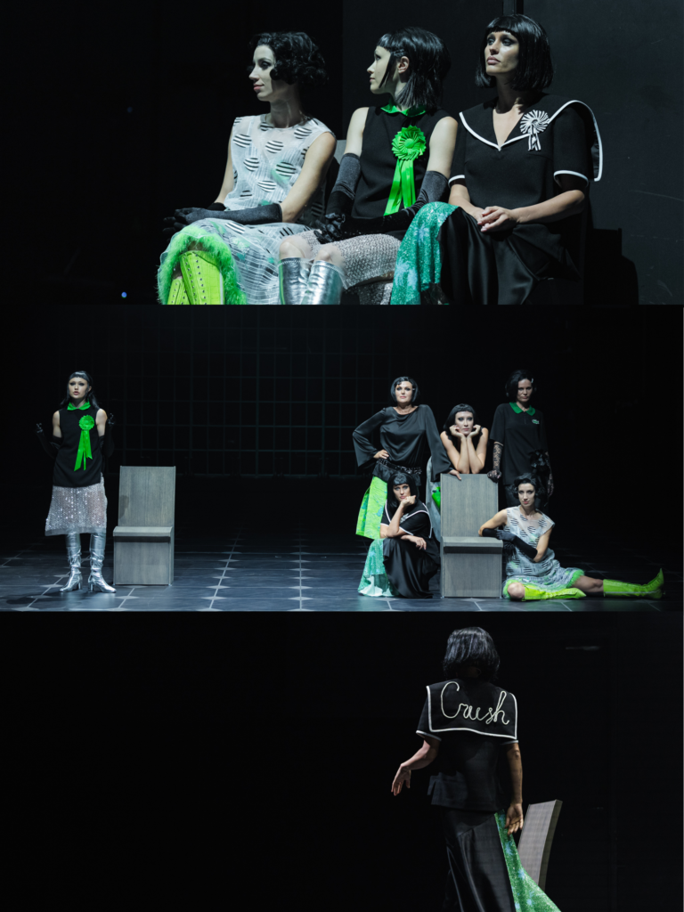 The performance “Milena” does not aim to reconstruct Milena and Kafka’s relationship, nor to present a documentary portrait of Milena; it seeks to rethink that connection through a kind of theatrical ‘editing’ of fragments. On stage are six actresses, each simultaneously Milena, Kafka, and herself, attempting to speak to Milena, while also acting as editors, arranging the chronology of the performance’s letter.